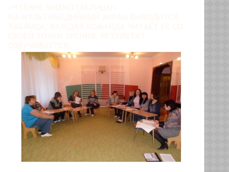 «Чтение мнемотаблицы»  На мультимедийный экран выводится таблица, каждая команда читает ее со своей точки зрения. Результат