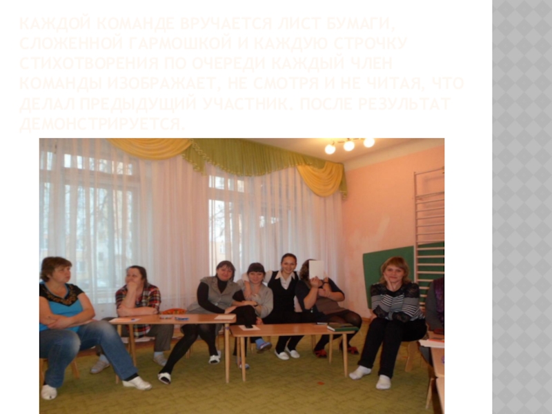 Слайд 14Каждой команде вручается лист бумаги, сложенной гармошкой и каждую строчку стихотворения