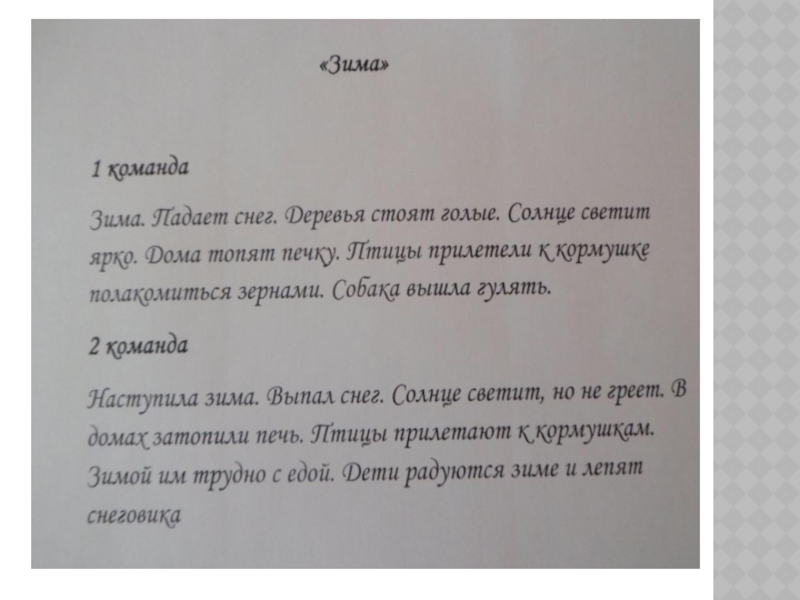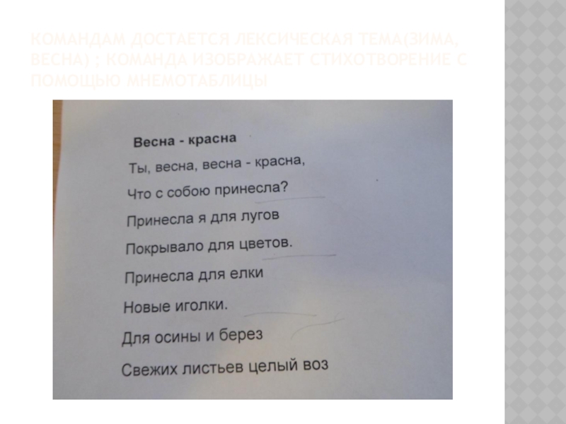Слайд 8Командам достается лексическая тема(зима, весна) ; команда изображает стихотворение с помощью