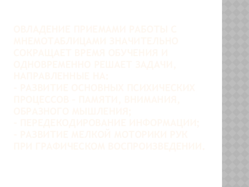 Слайд 20Овладение приемами работы с мнемотаблицами значительно сокращает время обучения и одновременно