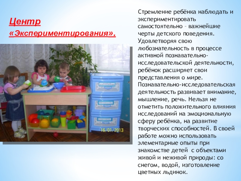 поведения. Удовлетворяя свою любознательность в процессе активной познавательно-исследовательской деятельности, ребёнок расширяет свои представления о мире. Познавательно-исследовательская деятельность развивает внимание, мышление, речь. Нельзя не отметить положительного влияния исследований на эмоциональную сферу ребёнка, на развитие творческих способностей. В своей работе можно использовать элементарные опыты при знакомстве детей с объектами живой и неживой природы: со снегом, водой, изготовление цветных льдинок.