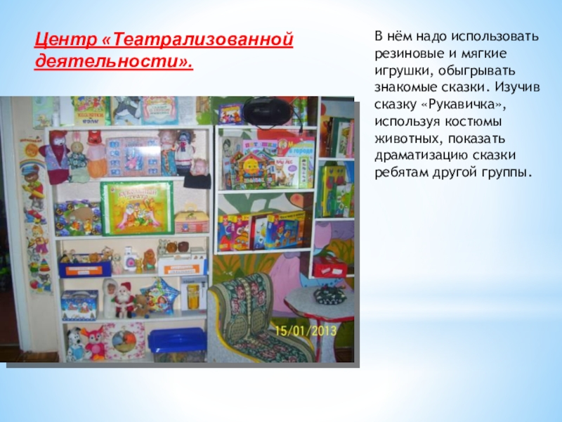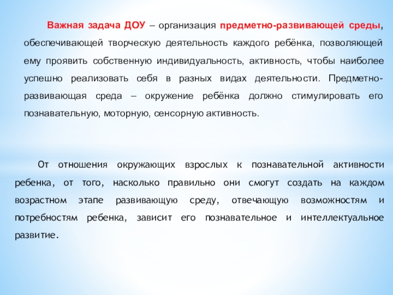 ребёнка, позволяющей ему проявить собственную индивидуальность, активность, чтобы наиболее успешно реализовать себя в разных видах деятельности. Предметно-развивающая среда – окружение ребёнка должно стимулировать его познавательную, моторную, сенсорную активность.
