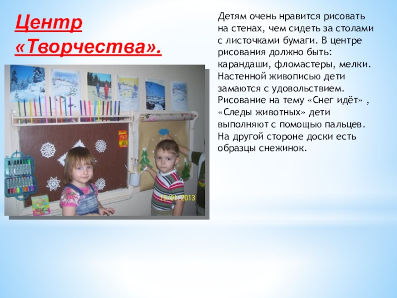 листочками бумаги. В центре рисования должно быть: карандаши, фломастеры, мелки. Настенной живописью дети замаются с удовольствием. Рисование на тему «Снег идёт» , «Следы животных» дети выполняют с помощью пальцев. На другой стороне доски есть образцы снежинок.