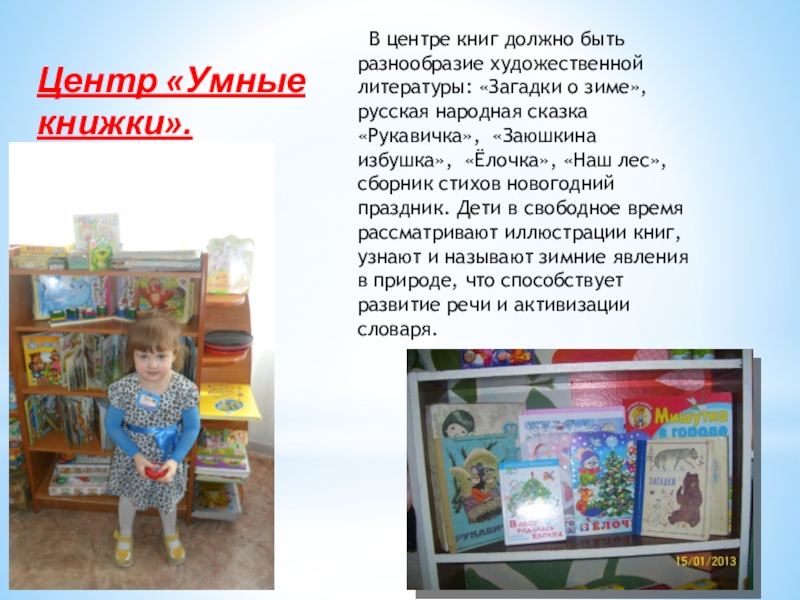 «Загадки о зиме», русская народная сказка «Рукавичка», «Заюшкина избушка», «Ёлочка», «Наш лес», сборник стихов новогодний праздник. Дети в свободное время рассматривают иллюстрации книг, узнают и называют зимние явления в природе, что способствует развитие речи и активизации словаря.