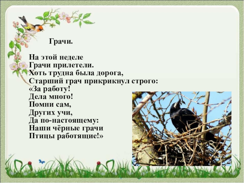 повсюду слышны трели, песни, чириканья, мелодичный свист. Вот возвращаются с теплых краев перелетные птицы - грач, жаворонок, скворец, зяблик, ласточка... Они весной строят гнёзда и откладывают в них яйца. Некоторые птицы уже в конце весны успевают вывести птенцов.