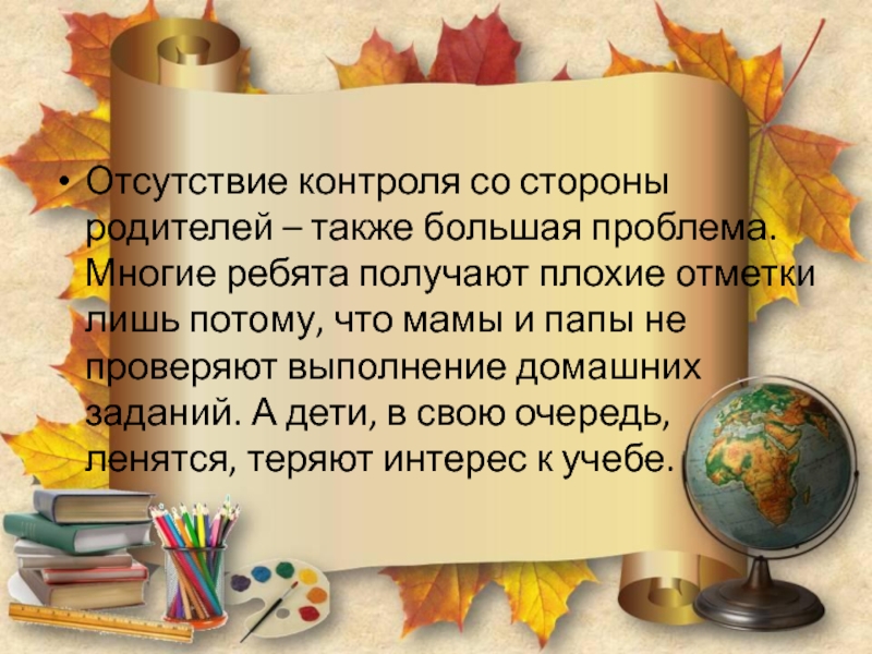 ребята получают плохие отметки лишь потому, что мамы и папы не проверяют выполнение домашних заданий. А дети, в свою очередь, ленятся, теряют интерес к учебе.