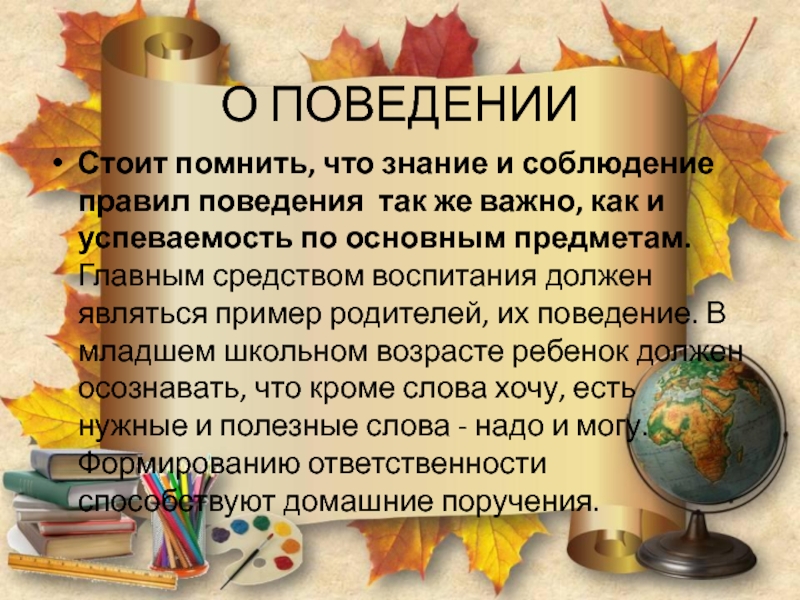 же важно, как и успеваемость по основным предметам. Главным средством воспитания должен являться пример родителей, их поведение. В младшем школьном возрасте ребенок должен осознавать, что кроме слова хочу, есть нужные и полезные слова - надо и могу. Формированию ответственности способствуют домашние поручения.