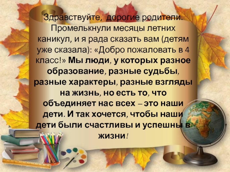 вам (детям уже сказала): «Добро пожаловать в 4 класс!» Мы люди, у которых разное образование, разные судьбы, разные характеры, разные взгляды на жизнь, но есть то, что объединяет нас всех – это наши дети. И так хочется, чтобы наши дети были счастливы и успешны в жизни!