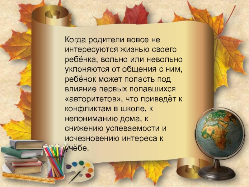 уклоняются от общения с ним, ребёнок может попасть под влияние первых попавшихся «авторитетов», что приведёт к конфликтам в школе, к непониманию дома, к снижению успеваемости и исчезновению интереса к учёбе.