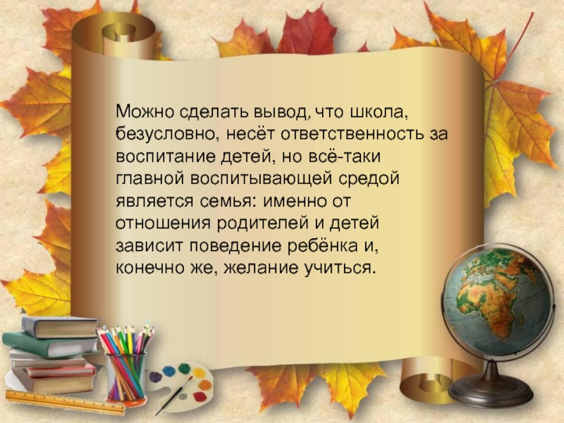 но всё-таки главной воспитывающей средой является семья: именно от отношения родителей и детей зависит поведение ребёнка и, конечно же, желание учиться.
