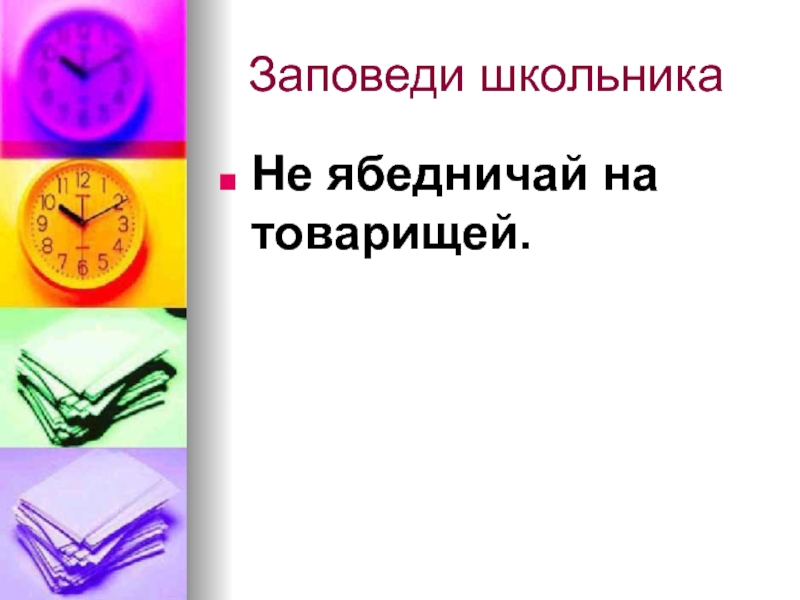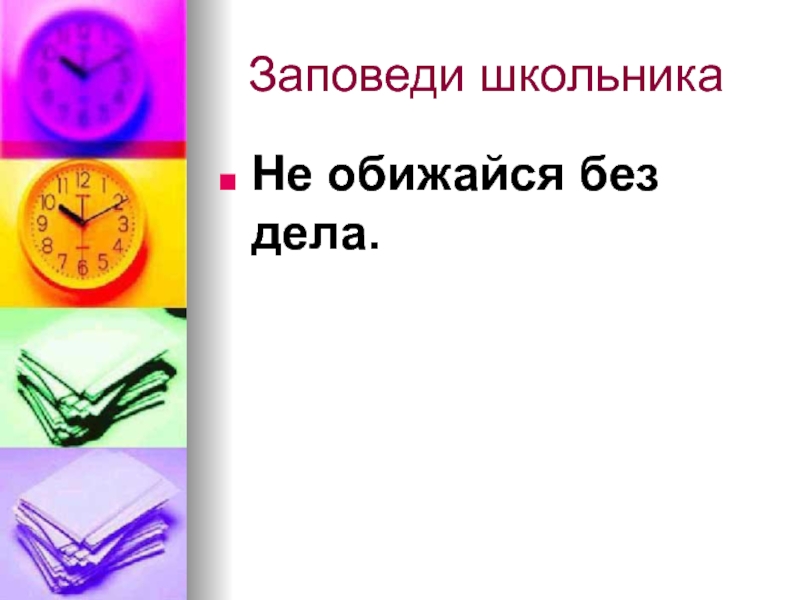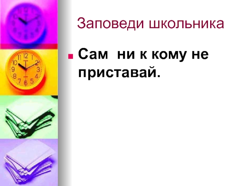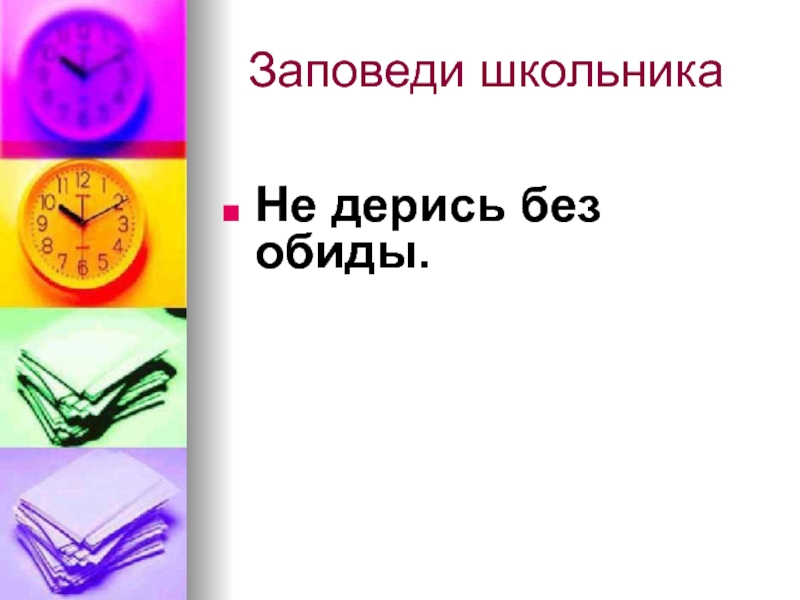 Заповеди школьникаНе дразни, не канючь, не выпрашивай ничего. Никого два раза ни о чём не проси.
