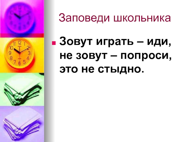 Заповеди школьникаЗовут играть – иди, не зовут – попроси, это не стыдно.