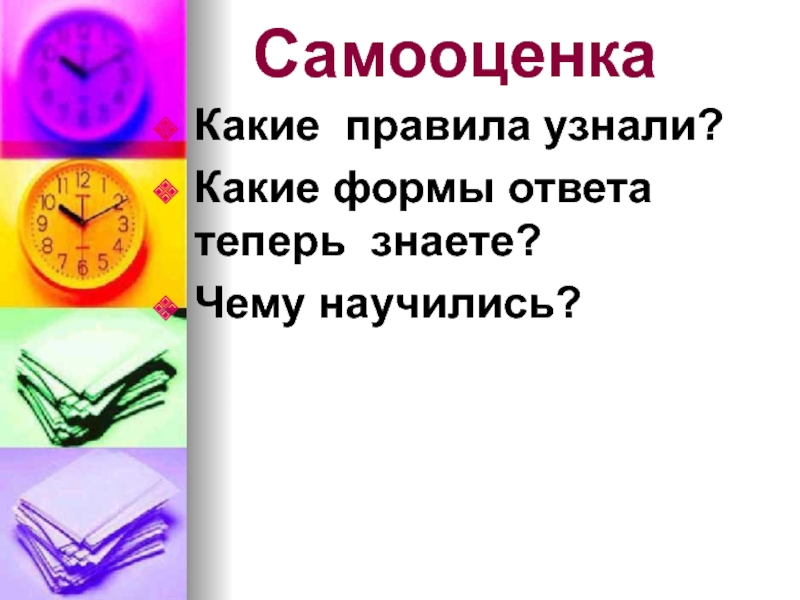 СамооценкаКакие правила узнали?Какие формы ответа теперь знаете?Чему научились?