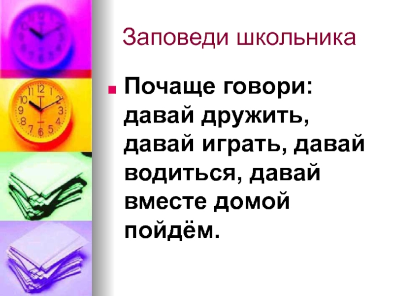Заповеди школьникаПочаще говори: давай дружить, давай играть, давай водиться, давай вместе домой пойдём.