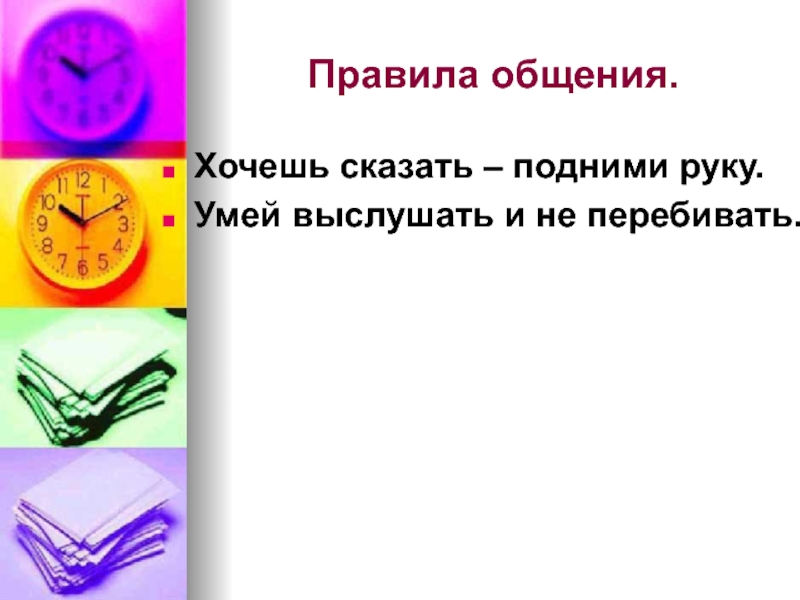 Правила общения.Хочешь сказать – подними руку.Умей выслушать и не перебивать.