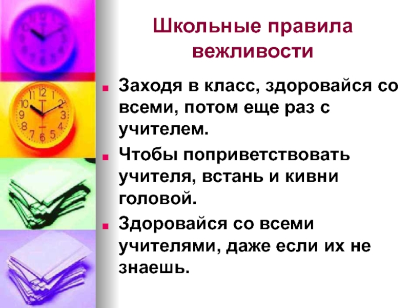 Школьные правила вежливостиЗаходя в класс, здоровайся со всеми, потом еще раз с учителем.Чтобы поприветствовать учителя, встань и