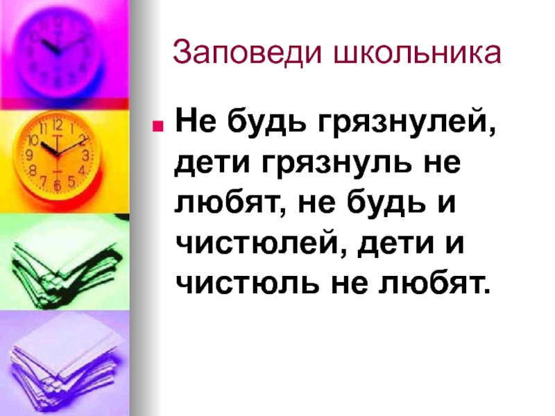 Заповеди школьникаНе будь грязнулей, дети грязнуль не любят, не будь и чистюлей, дети и чистюль не