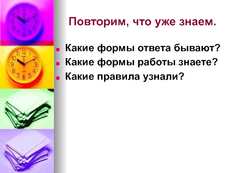 Повторим, что уже знаем.Какие формы ответа бывают?Какие формы работы знаете?Какие правила узнали?