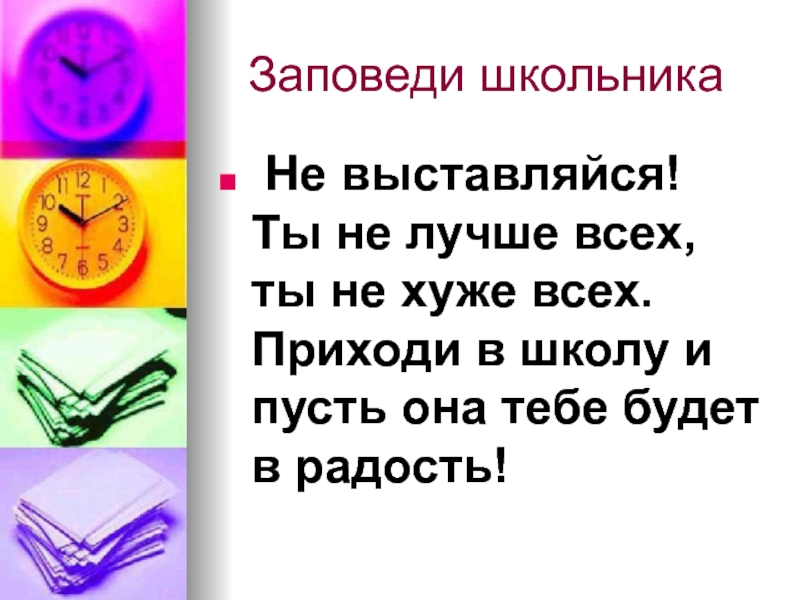 Заповеди школьника Не выставляйся! Ты не лучше всех, ты не хуже всех. Приходи в школу и