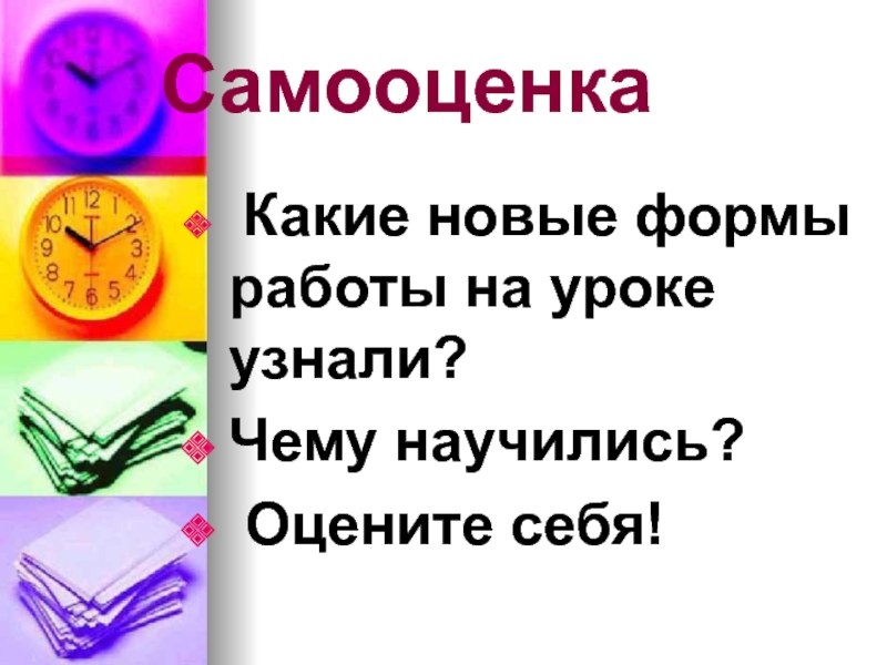Самооценка Какие новые формы работы на уроке узнали?Чему научились? Оцените себя!