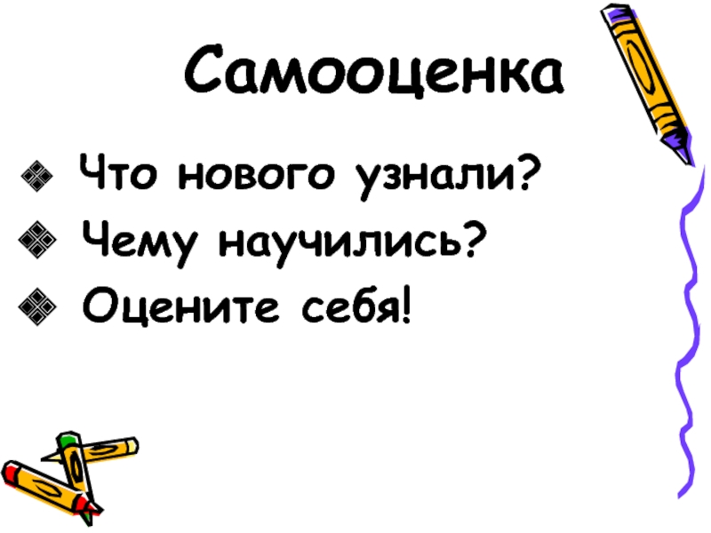 Самооценка Что нового узнали? Чему научились? Оцените себя!