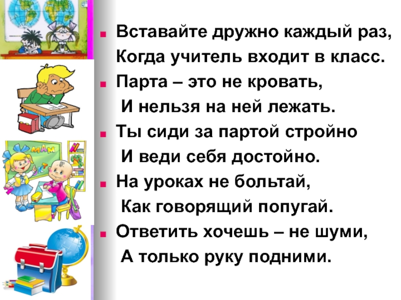 Вставайте дружно каждый раз,  Когда учитель входит в класс.Парта – это не кровать,  И нельзя