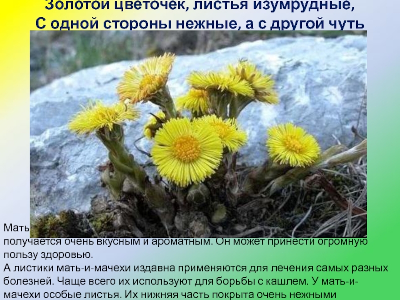 А листики мать-и-мачехи издавна применяются для лечения самых разных болезней. Чаще всего их используют для борьбы с кашлем. У мать-и-мачехи особые листья. Их нижняя часть покрыта очень нежными волосками, а поверхность листика – более жесткая и холодная на ощупь.