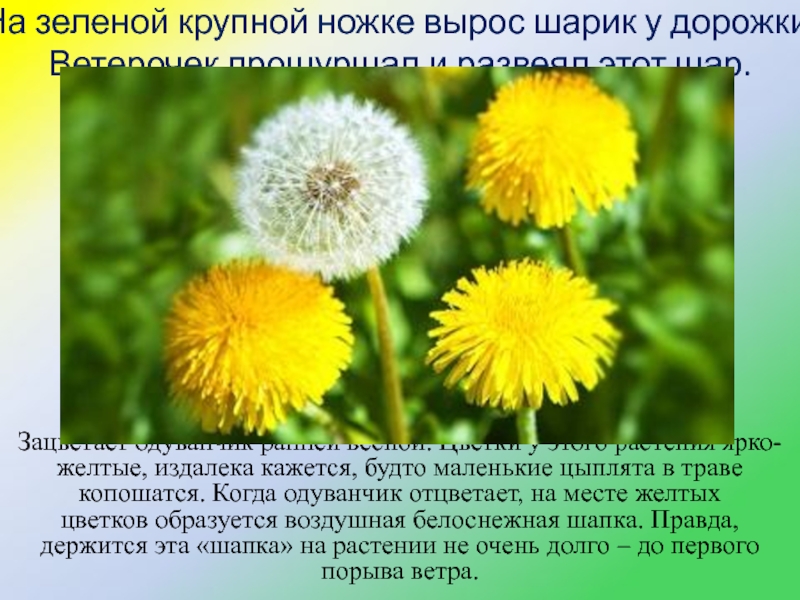 Зацветает одуванчик ранней весной. Цветки у этого растения ярко-желтые, издалека кажется, будто маленькие цыплята в траве копошатся. Когда одуванчик отцветает, на месте желтых цветков образуется воздушная белоснежная шапка. Правда, держится эта «шапка» на растении не очень долго – до первого порыва ветра.