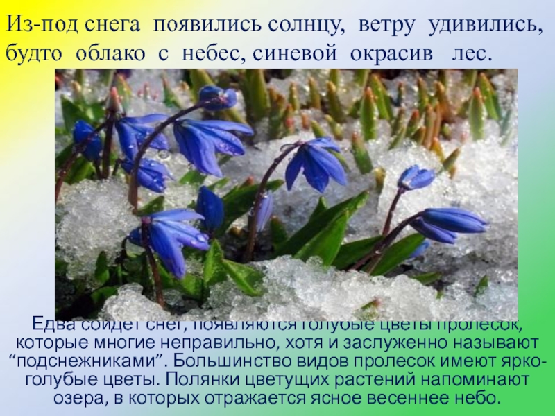 Едва сойдет снег, появляются голубые цветы пролесок, которые многие неправильно, хотя и заслуженно называют “подснежниками”. Большинство видов пролесок имеют ярко-голубые цветы. Полянки цветущих растений напоминают озера, в которых отражается ясное весеннее небо.