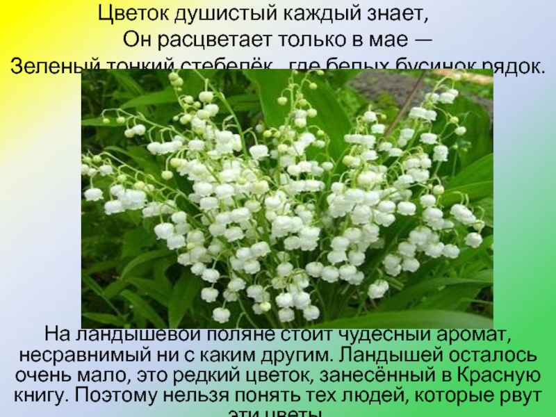 На ландышевой поляне стоит чудесный аромат, несравнимый ни с каким другим. Ландышей осталось очень мало, это редкий цветок, занесённый в Красную книгу. Поэтому нельзя понять тех людей, которые рвут эти цветы.