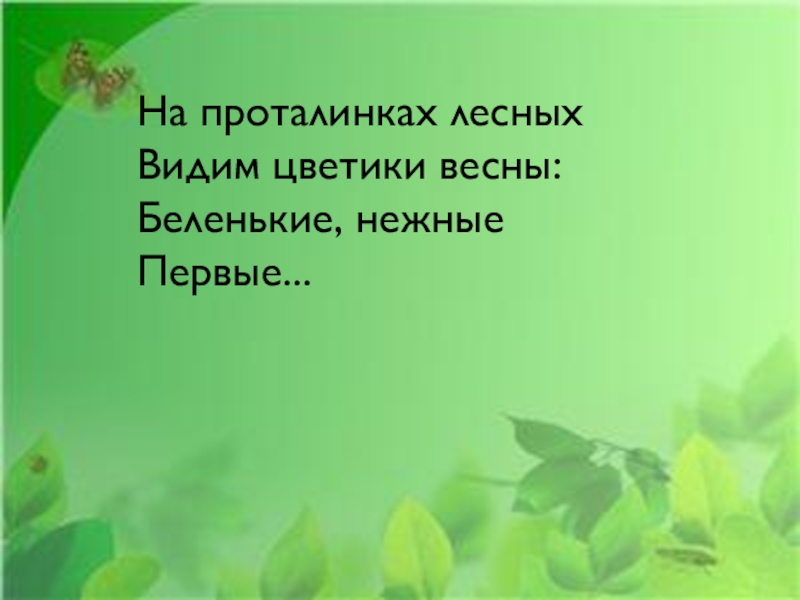 На проталинках лесных Видим цветики весны: Беленькие, нежные Первые...