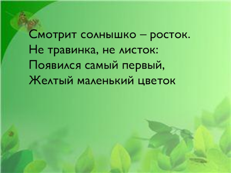 Слайд 10Смотрит солнышко – росток. Не травинка, не листок: Появился самый первый, Желтый маленький цветок