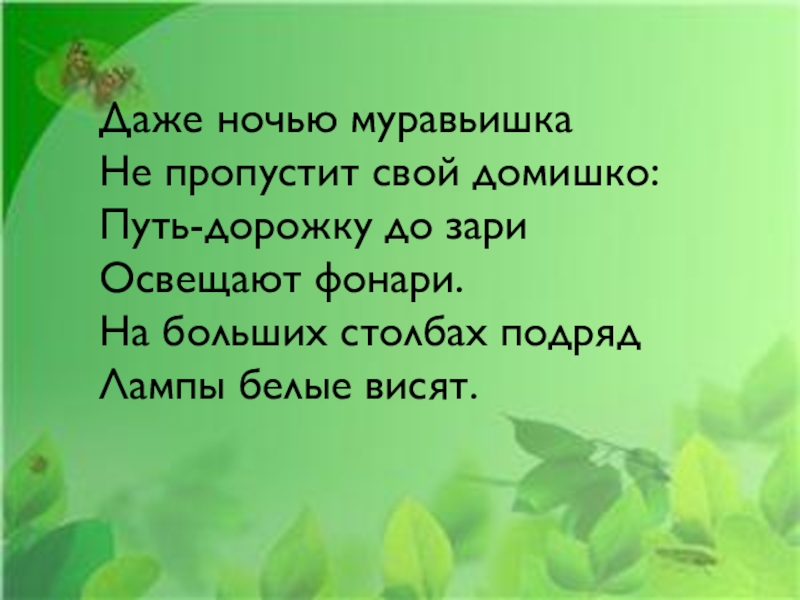 Слайд 6Даже ночью муравьишка Не пропустит свой домишко: Путь-дорожку до зари Освещают фонари. На больших столбах
