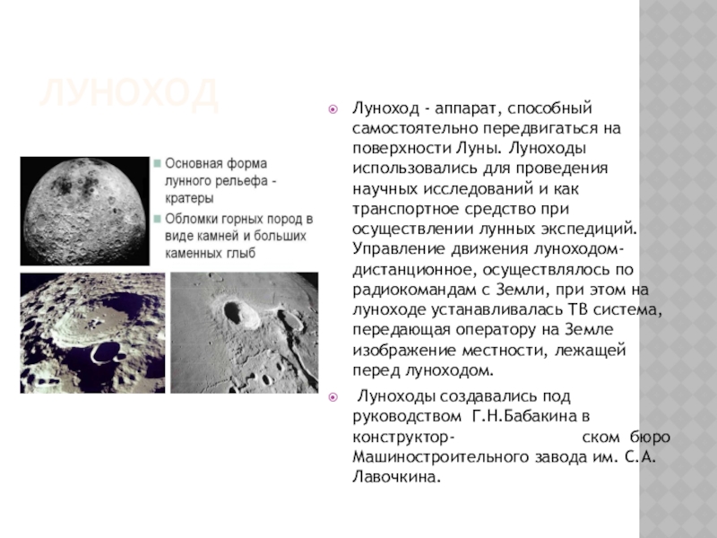 ЛуноходЛуноход - аппарат, способный самостоятельно передвигаться на поверхности Луны. Луноходы использовались для проведения научных исследований и как транспортное средство при осуществлении лунных экспедиций. Управление движения луноходом- дистанционное, осуществлялось по радиокомандам с Земли, при этом на луноходе