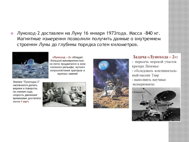 Слайд 5Луноход-2 доставлен на Луну 16 января 1973года. Масса -840 кг. Магнитные