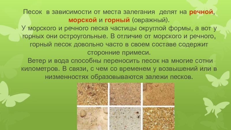 Вулканические пески, например, могут содержать кусочки минералов красного цвета, и тогда пляж будет красным. В мире есть несколько пляжей, где в составе песка встречается зеленый минерал хризолит. Поэтому пляжи там зеленые. А в некоторых странах встречаются черные пески, содержащие много тяжелых минералов, таких как гематит или магнетит.