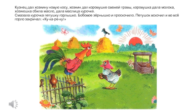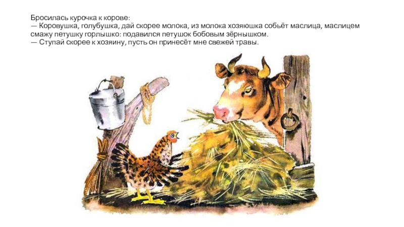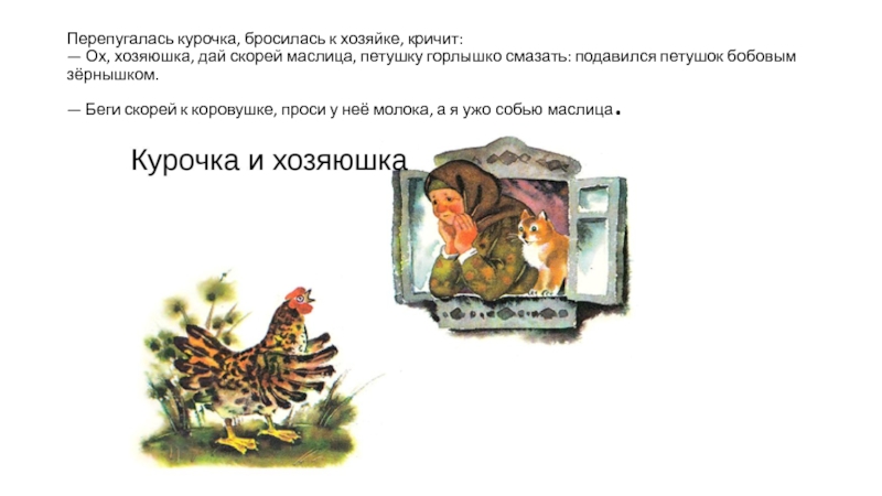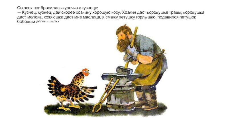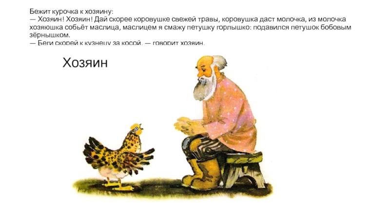 Клевал как-то петушок бобовые зёрнышки да второпях и подавился. Подавился, не дышит, не слышит, словно мёртвый лежит.