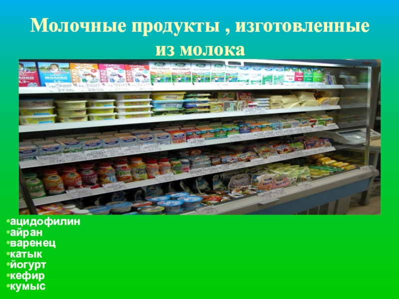 Слайд 17 Кефир – кисломолочный напиток, заквашенный с помощью так