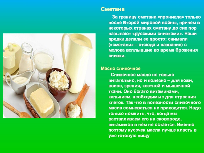 мировой войны, причем в некоторых странах сметану до сих пор называют «русскими сливками». Наши предки делали ее просто: снимали («сметали» – отсюда и название) с молока всплывшие во время брожения сливки.