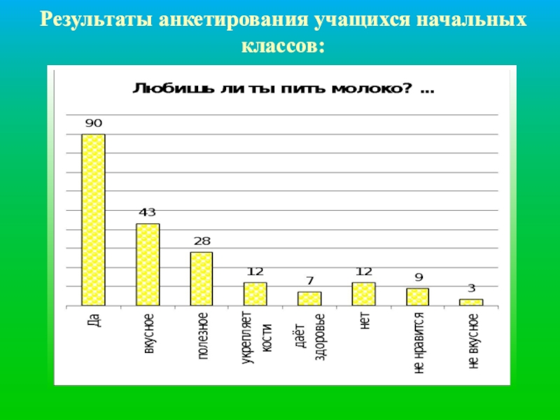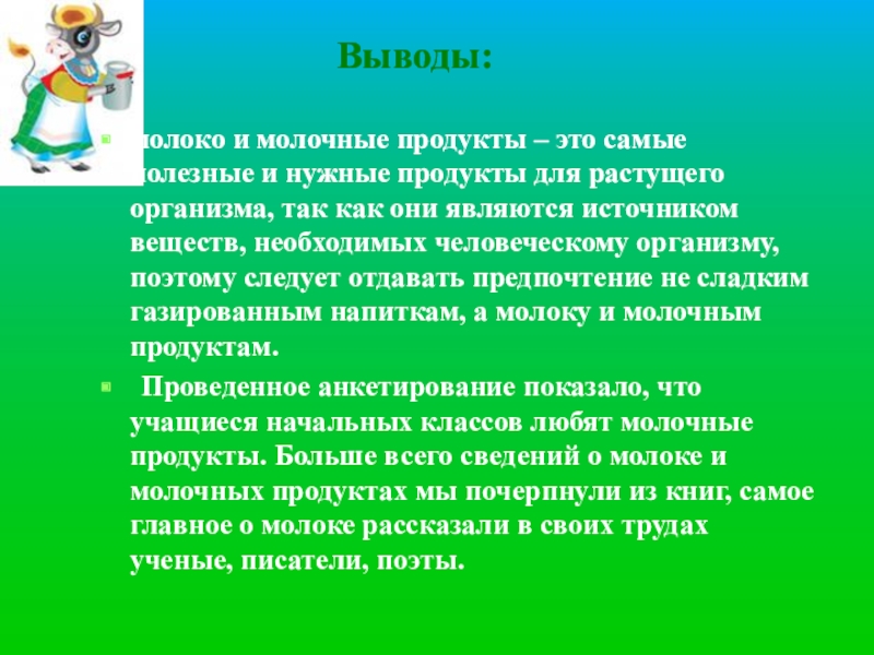 Проведенное анкетирование показало, что учащиеся начальных классов любят молочные продукты. Больше всего сведений о молоке и молочных продуктах мы почерпнули из книг, самое главное о молоке рассказали в своих трудах ученые, писатели, поэты.