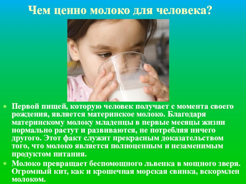 своего рождения, является материнское молоко. Благодаря материнскому молоку младенцы в первые месяцы жизни нормально растут и развиваются, не потребляя ничего другого. Этот факт служит прекрасным доказательством того, что молоко является полноценным и незаменимым продуктом питания.
