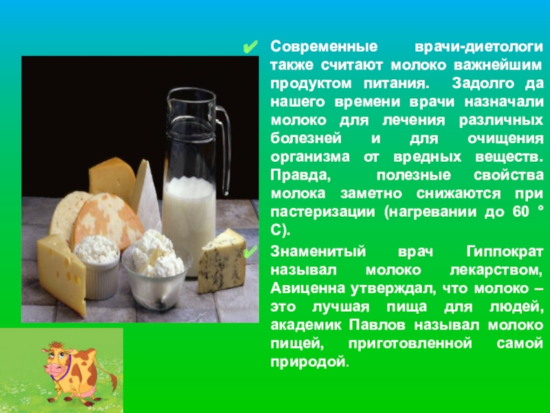 Слайд 8Современные врачи-диетологи также считают молоко важнейшим продуктом питания. Задолго да нашего
