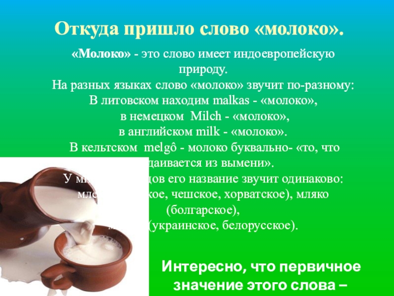 У многих народов его название звучит одинаково: млеко(польское, чешское, хорватское), мляко(болгарское),
