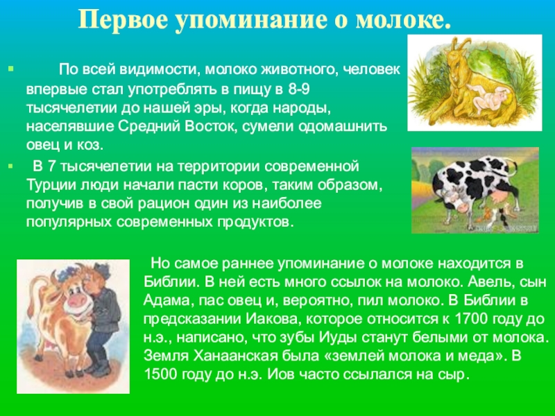 Но самое раннее упоминание о молоке находится в Библии. В ней есть много ссылок на молоко. Авель, сын Адама, пас овец и, вероятно, пил молоко. В Библии в предсказании Иакова, которое относится к 1700 году до н.э., написано, что зубы Иуды станут белыми от молока. Земля Ханаанская была «землей молока и меда». В 1500 году до н.э. Иов часто ссылался на сыр.