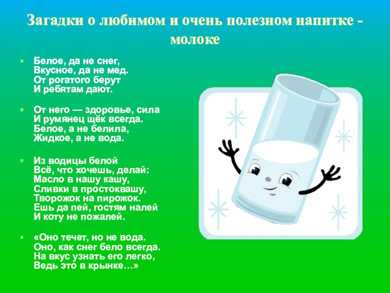 Слайд 9Загадки о любимом и очень полезном напитке - молоке