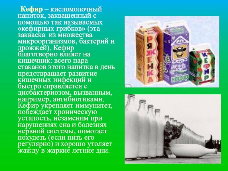 называемых «кефирных грибков» (эта закваска из множества микроорганизмов, бактерий и дрожжей). Кефир благотворно влияет на кишечник: всего пара стаканов этого напитка в день предотвращает развитие кишечных инфекций и быстро справляется с дисбактериозом, вызванным, например, антибиотиками. Кефир укрепляет иммунитет, побеждает хроническую усталость, незаменим при нарушениях сна и болезнях нервной системы, помогает похудеть (если пить его регулярно) и хорошо утоляет жажду в жаркие летние дни.