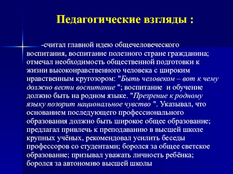 В классической статье «Вопросы жизни» рассмотрел фундаментальные проблемы российского воспитания. Показал нелепость сословного воспитания, разлад между школой и жизнью. Выдвинул в качестве главной цели воспитания формирование высоконравственной личности, готовой отрешиться от эгоистических устремлений ради блага общества. Считал, что для этого необходимо перестроить всю систему образования на основе принципах гуманизма и демократизма. Система образования, обеспечивающая развитие личности, должна строиться на научной основе, начиная от начальной и кончая высшей школой, и обеспечивать преемственность всех систем образования.