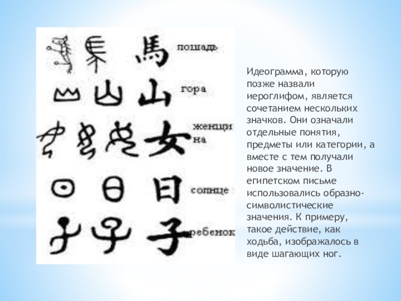 Идеограмма – иероглифы.Идеограмма, которую позже назвали иероглифом, является сочетанием нескольких значков. Они означали отдельные понятия, предметы или