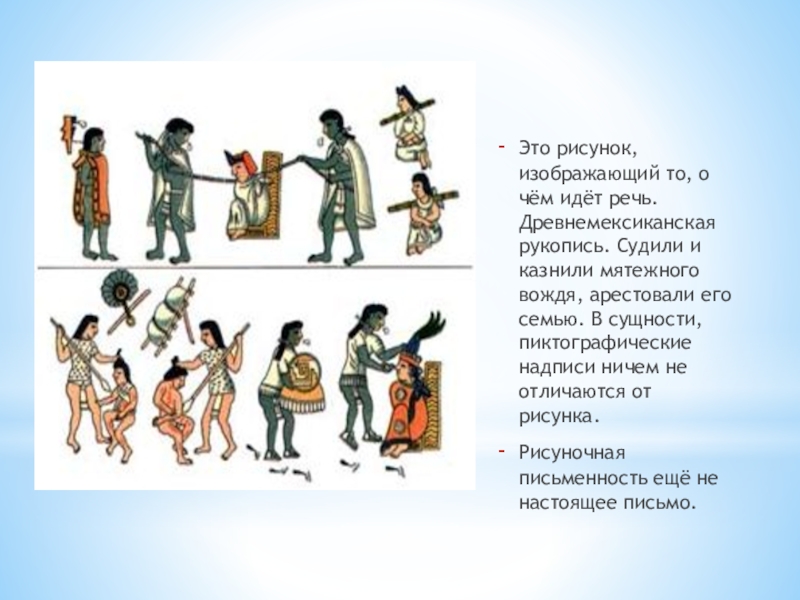 Рисуночное письмоЭто рисунок, изображающий то, о чём идёт речь. Древнемексиканская рукопись. Судили и казнили мятежного вождя, арестовали
