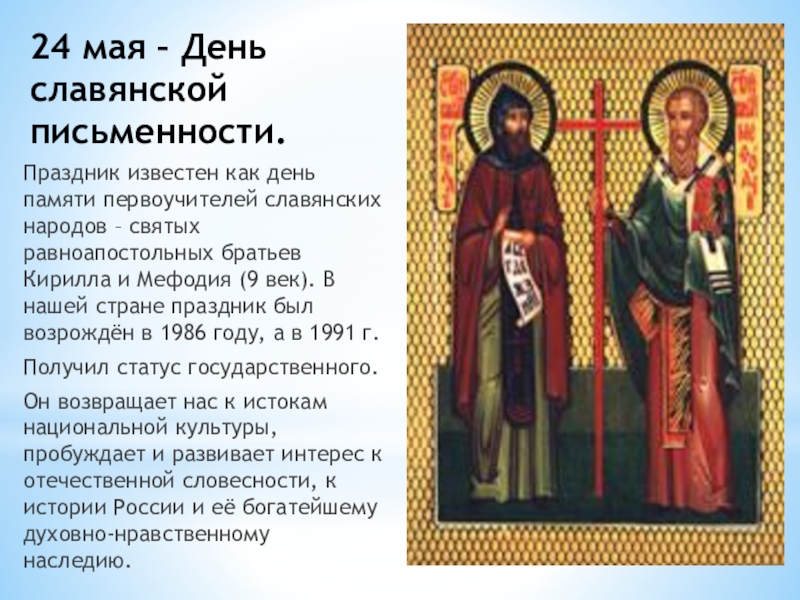 славянских народов – святых равноапостольных братьев Кирилла и Мефодия (9 век). В нашей стране праздник был возрождён в 1986 году, а в 1991 г.